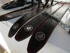 Kožna sigurnosna oglica (ručni rad) sa dodatnim ojačanjima je namenjena za pse sa jakim nagonima za plenom (stafordi, pit bulovi, bul terijeri). Oglica je široka 5 cm, a dugačka 65 cm i širine 7 mm, sa dodatnim duplim metalnim okovima. Cena ogrlice je 30 € i izrađuje se po narudžbi.